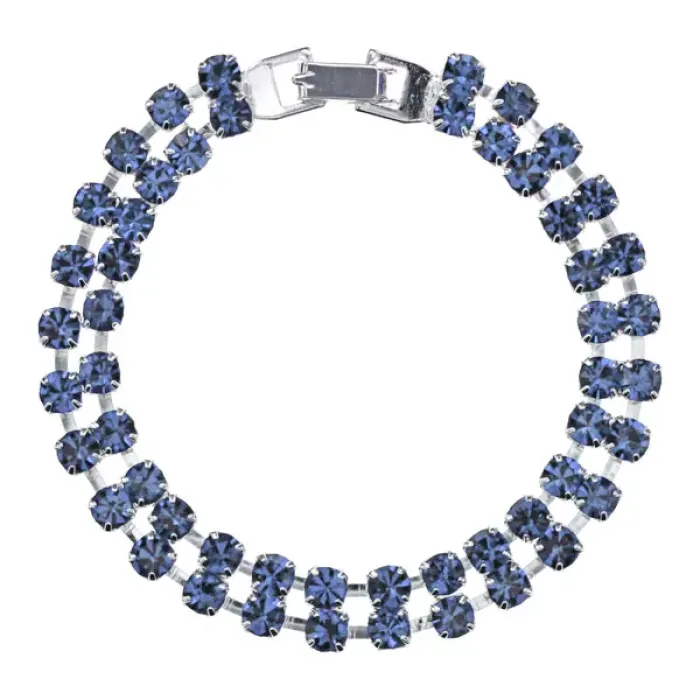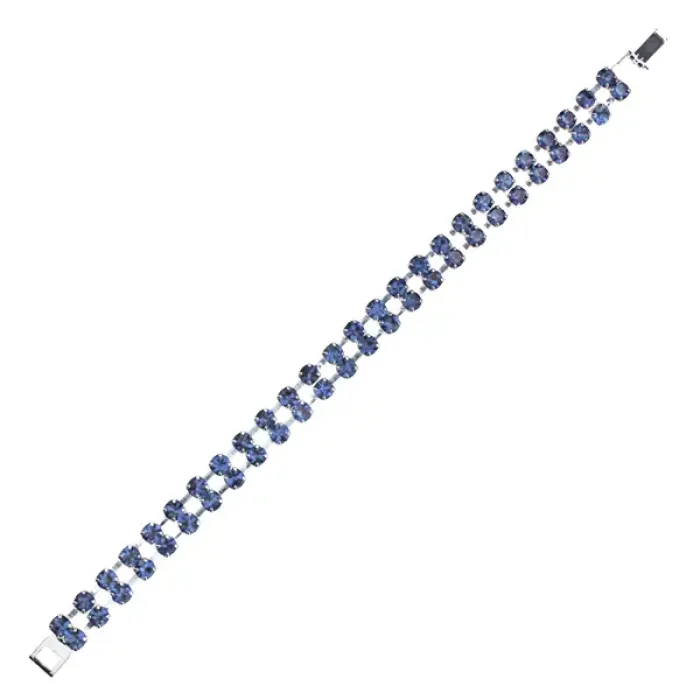 Браслет из бижутерного сплава со стразами синего цвета и коробчатым замком.