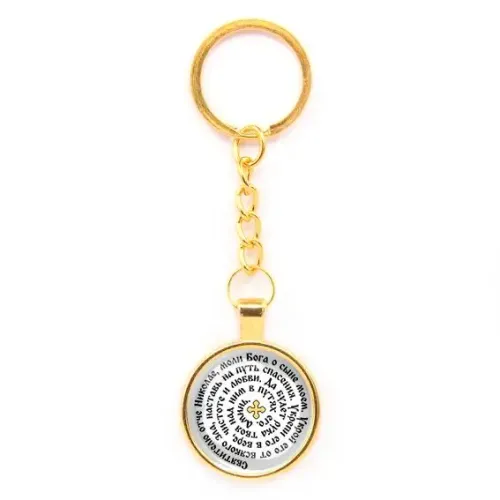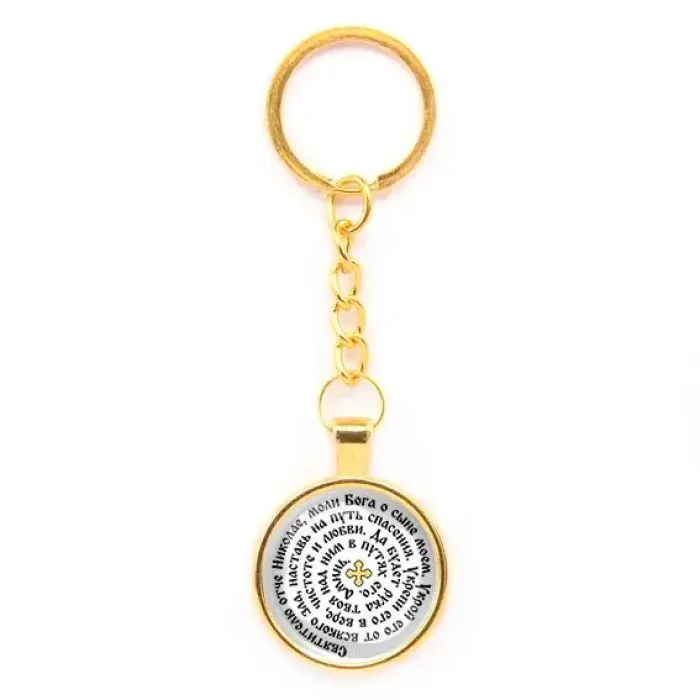 Круглый брелок с молитвой Николаю Чудотворцу — это не только стильный аксессуар, но и символ надежды и защиты. Он создан из бижутерного сплава с покрытием под золото и дополнен стеклянной линзой, которая защищает изображение. Размер изделия составляет 28х95 мм вместе с кольцом и цепочкой.