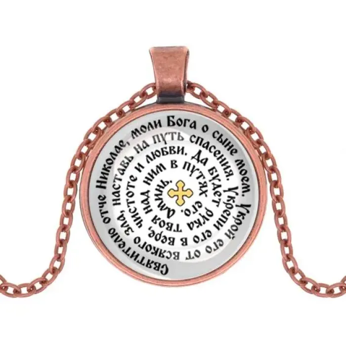 Кулон с молитвой Николаю Чудотворцу — это не только стильный аксессуар, но и символ надежды и защиты. Он традиционно используется как оберег для сыновей, привнося в жизнь веру и спокойствие. Изготовлен из бижутерного сплава с покрытием под медь и стекла, этот кулон станет прекрасным подарком для близких.