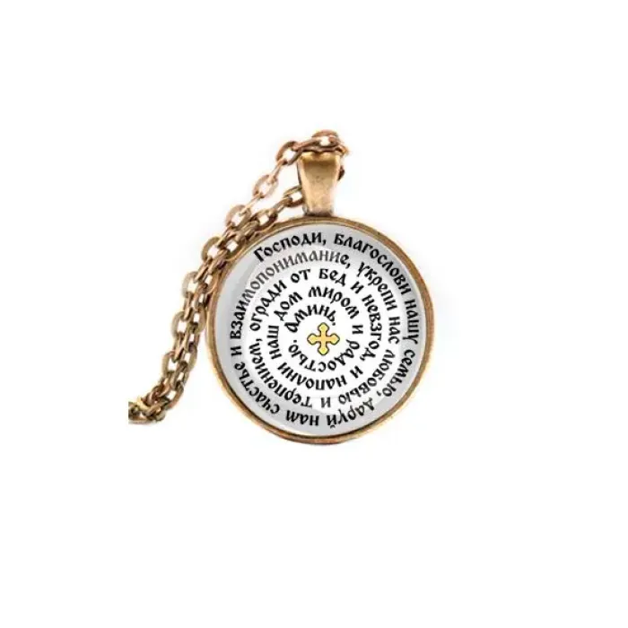 Кулон с молитвой Господу Богу за семью — это не только стильное украшение, но и символ духовной защиты и благополучия. Изготовленный из бижутерного сплава с покрытием под бронзу и стеклом, этот кулон станет прекрасным подарком для близких. Основные особенности: