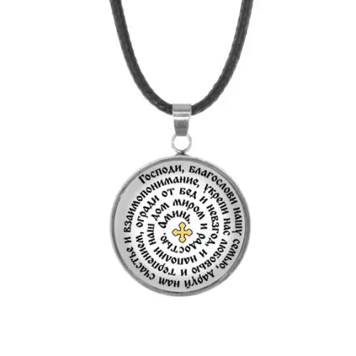Кулон из нержавеющей стали — это не только стильный аксессуар, но и символ глубоких семейных ценностей. Изображение молитвы под выпуклой стеклянной линзой придаёт изделию особую значимость и защищает его от повреждений.