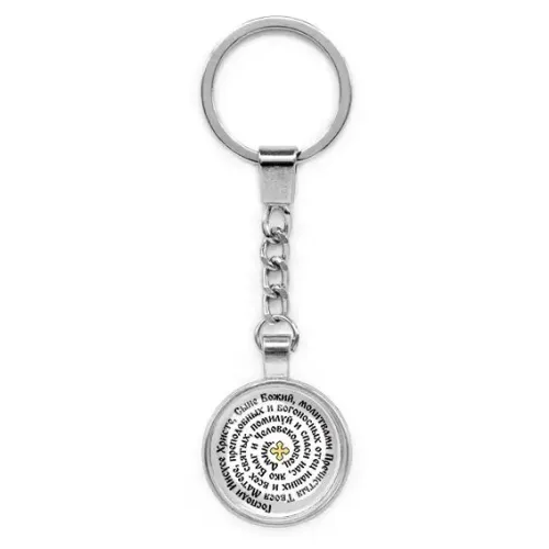 Круглый брелок с молитвой Иисусу Христу о спасении — это не только стильный аксессуар, но и символ веры. Изготовленный из бижутерного сплава с покрытием под серебро и стекла, он привносит в повседневную жизнь духовное значение. Размеры брелка вместе с кольцом и цепочкой составляют 28х95 мм, что делает его удобным для ношения на ключах или сумке.