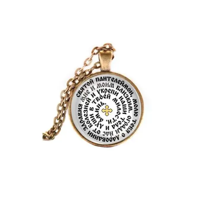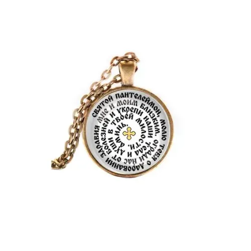 Кулон с молитвой Пантелеймону Целителю — это не только стильный аксессуар, но и символ надежды на здоровье. Изготовленный из бижутерного сплава с покрытием под бронзу и стекла, он станет прекрасным дополнением к любому образу.