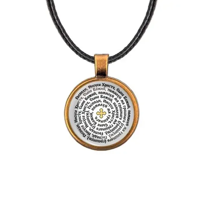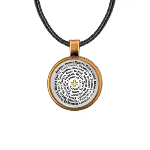 Кулон с изображением Иисусовой молитвы — это не только стильный аксессуар, но и символ духовной силы. Он выполнен из бижутерного сплава с покрытием под бронзу и стекла, что придаёт изделию уникальный вид. Диаметр кулона составляет 28 мм, а длина шнурка — 45 см. Застёжка типа лобстер обеспечивает надёжность ношения. Изображение защищено выпуклой стеклянной линзой, что добавляет дополнительную защиту и блеск.