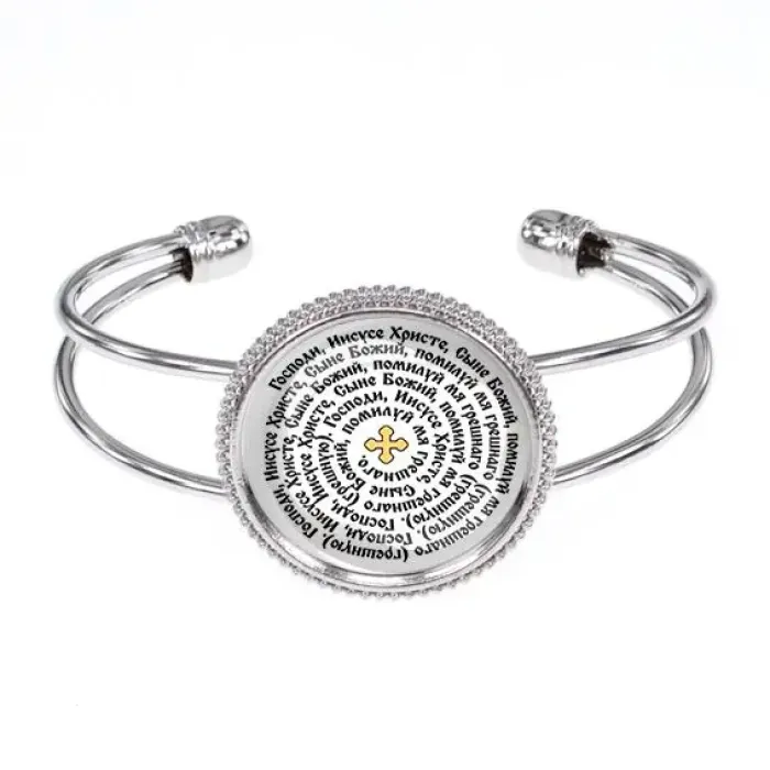 Браслет из бижутерного сплава с изображением Иисусовой молитвы под выпуклой стеклянной линзой — это не только стильный аксессуар, но и символ веры. Его диаметр составляет 25 мм, что делает его заметным элементом любого образа. Безразмерный дизайн позволяет носить браслет на любой руке, а покрытие под серебро придаёт ему элегантный вид. Изготовленный из качественного бижутерного сплава и стекла, этот браслет станет прекрасным подарком для близких или дополнением к личной коллекции сувениров. Традиционно такие изделия ценятся за их духовное значение и эстетическую привлекательность.