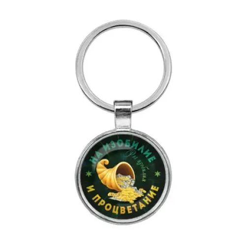 Брелок из бижутерного сплава и стекла с символикой изобилия и процветания.