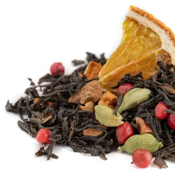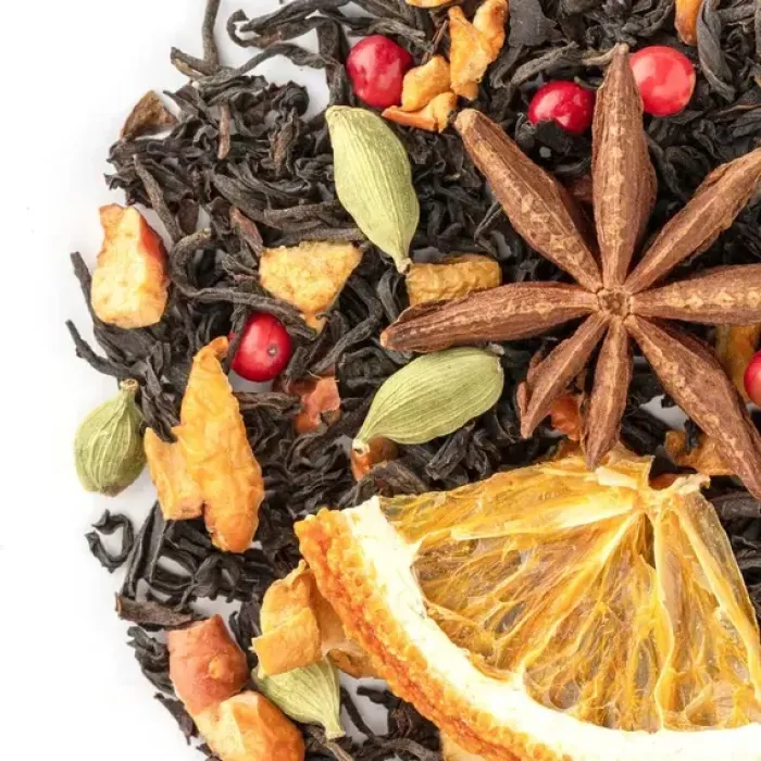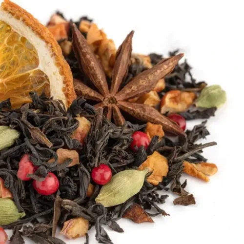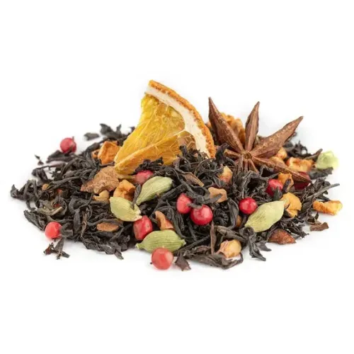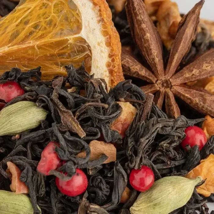Этот ароматизированный чёрный чай создаёт атмосферу зимнего уюта, наполняя пространство согревающим букетом восточных пряностей. Его насыщенный вкус и тёмный настой идеально передают характер классического глинтвейна.