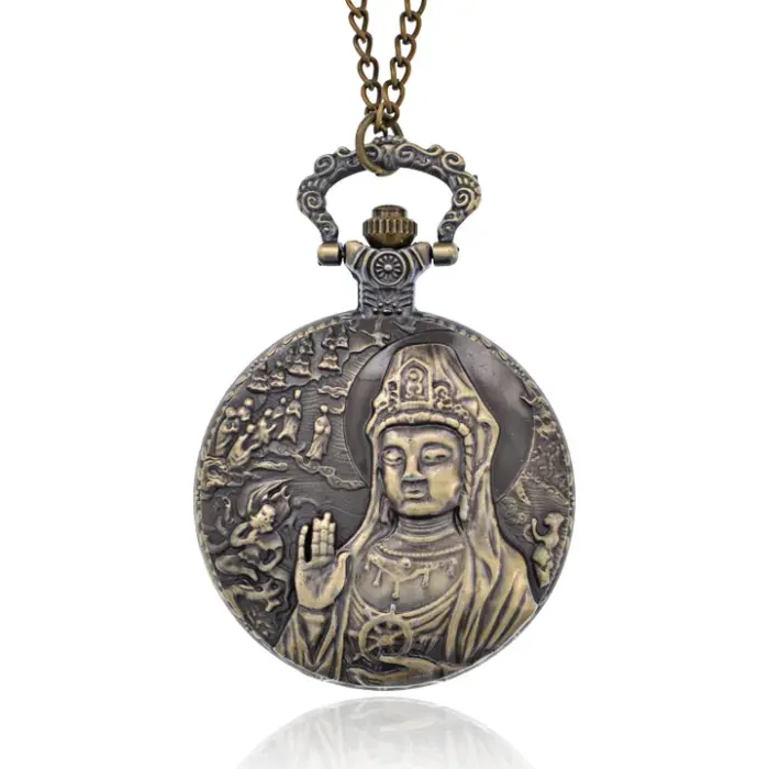 Кулон-часы с изображением Гуаньинь. Изготовлен из металла с покрытием под бронзу, имеет открывающийся корпус.