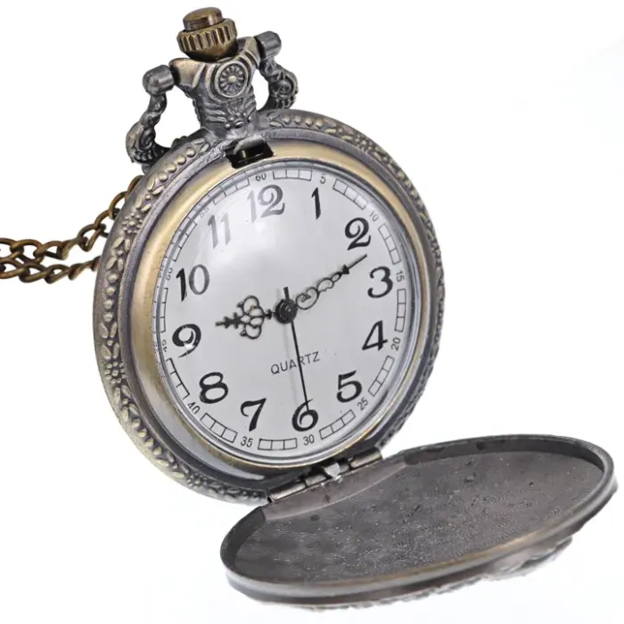 Материал и изготовление: Металл с покрытием под бронзу. Механизм часов открывается при помощи кнопки.