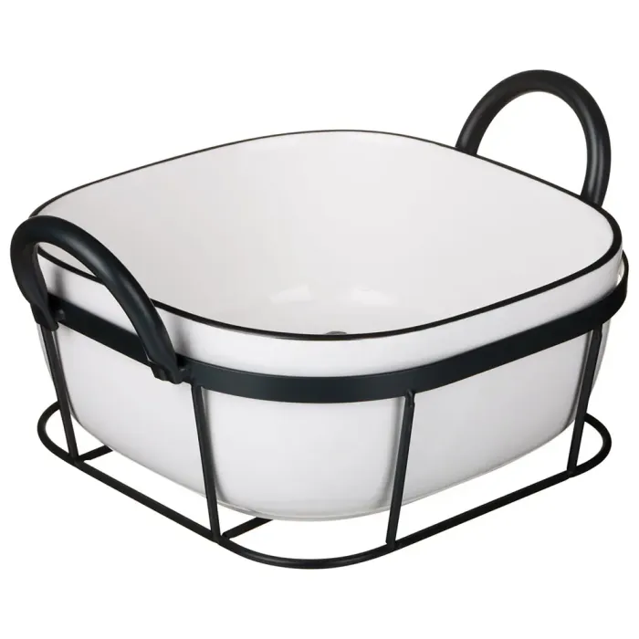Основная часть формы изготовлена из фарфора, который подходит для использования в духовом шкафу и микроволновой печи. Металлическая подставка обеспечивает устойчивость конструкции. Изделие сертифицировано для безопасного контакта с пищевыми продуктами.