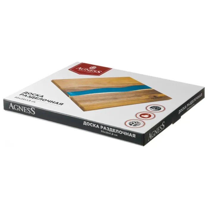 Разделочная доска Agness предназначена для нарезки продуктов и сервировки блюд. Основные преимущества модели — использование натуральной древесины акации и декоративная вставка из эпоксидной смолы, которая формирует её уникальный дизайн.