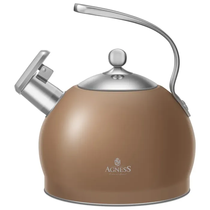 Чайник со свистком Agness предназначен для кипячения воды на плите. Изделие изготовлено из нержавеющей стали марки 304, оснащено термоаккумулирующим дном и совместимо с индукционными варочными панелями.