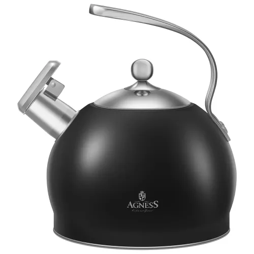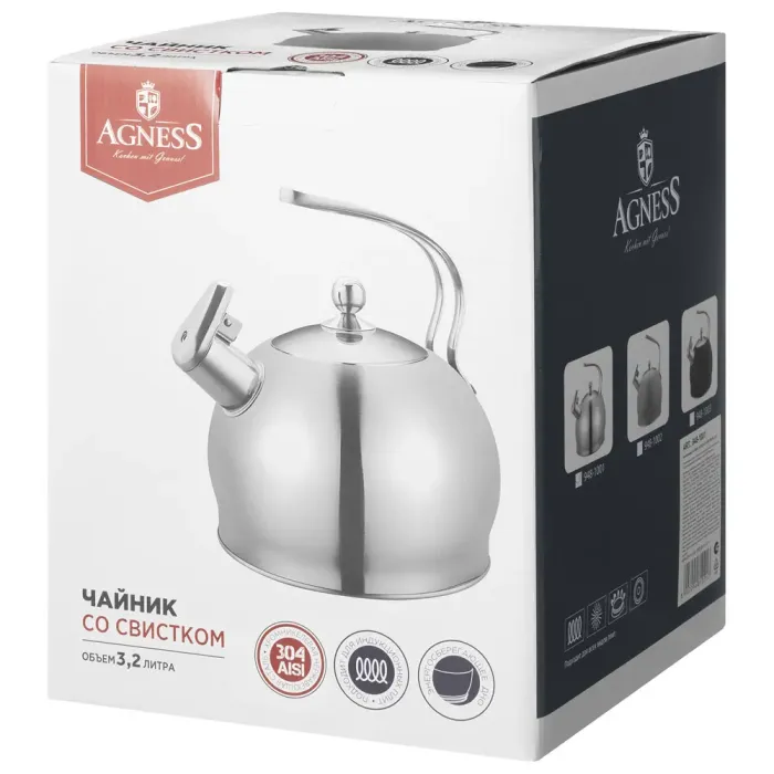 Чайник со свистком Agness объёмом 3.2 литра предназначен для кипячения воды на плите. Его ключевыми особенностями являются термоаккумулирующее дно и корпус из нержавеющей стали марки 304.