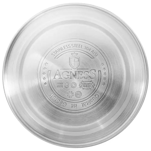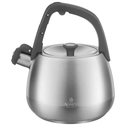 Чайник со свистком Agness объёмом 2,5 литра предназначен для кипячения воды на плите. Модель изготовлена из нержавеющей стали марки 304 и оснащена термоаккумулирующим дном.