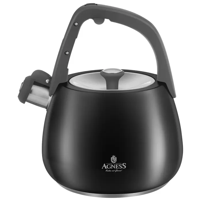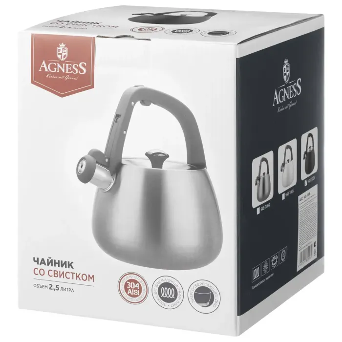 Чайник со свистком Agness объёмом 2.5 литра предназначен для кипячения воды на плите. Изготовлен из нержавеющей стали марки 304, модель оснащена термоаккумулирующим дном и совместима с индукционными варочными панелями.