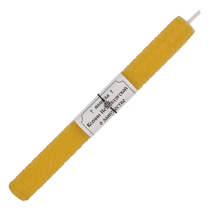 Свеча с молитвой Ксении Петербургской о замужестве — это не только красивый элемент декора, но и символ надежды на счастье в личной жизни. Изготовленная из 100% натурального пчелиного воска, она наполняет пространство сладким медовым ароматом, создавая атмосферу уюта и тепла.