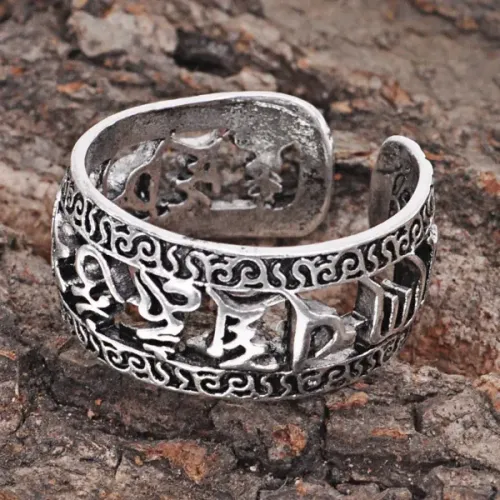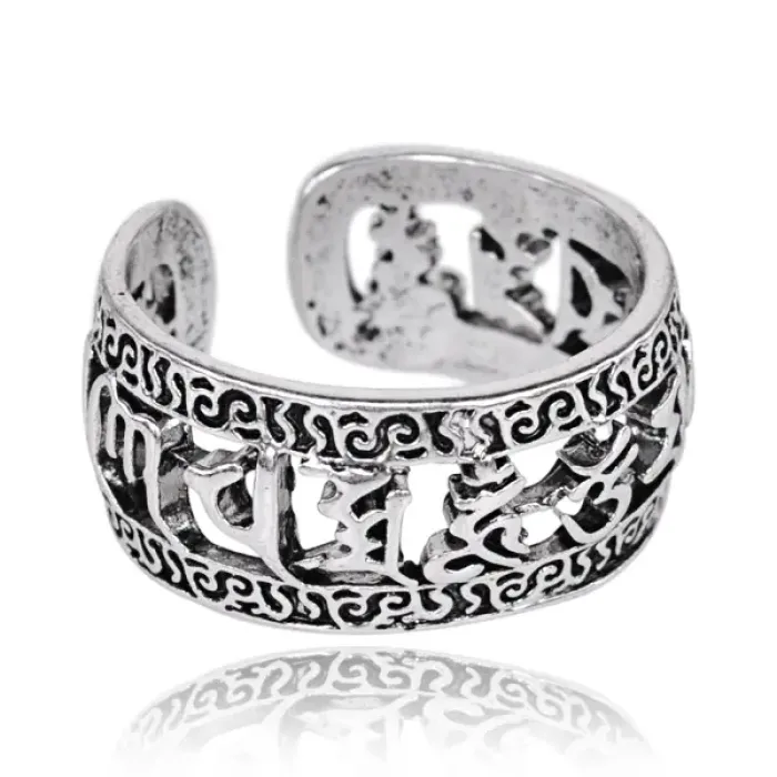 Безразмерное кольцо-амулет из бижутерного сплава с нанесёнными мантрами и серебристым покрытием.