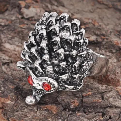Безразмерное кольцо с фигуркой ёжика и вставками из страз. Материал — бижутерный сплав с покрытием под серебро.