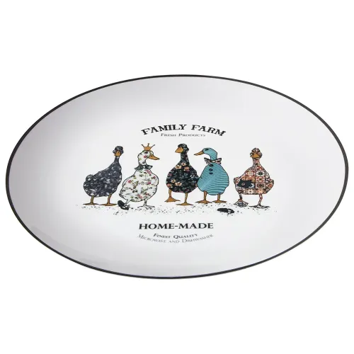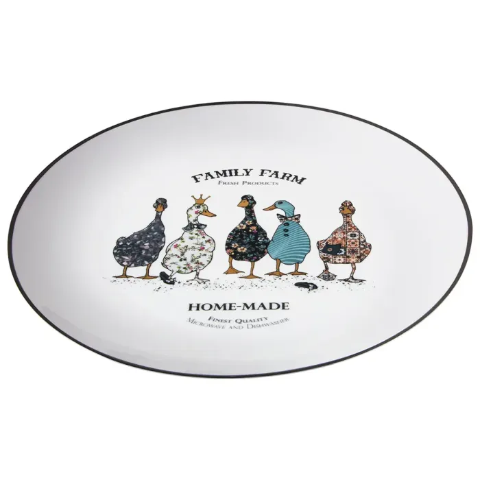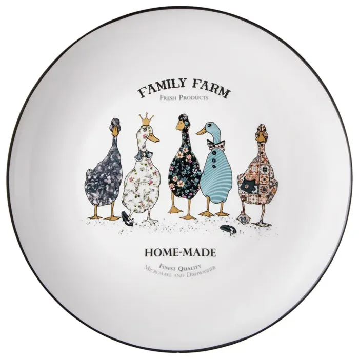 Тарелки выполнены из фарфора, что обеспечивает гигиеничность и прочность. Поверхность покрыта глазурью для устойчивости к загрязнениям. Дизайн включает нанесённое изображение гусей, которое является частью тематики коллекции.