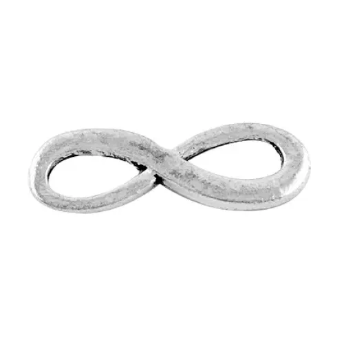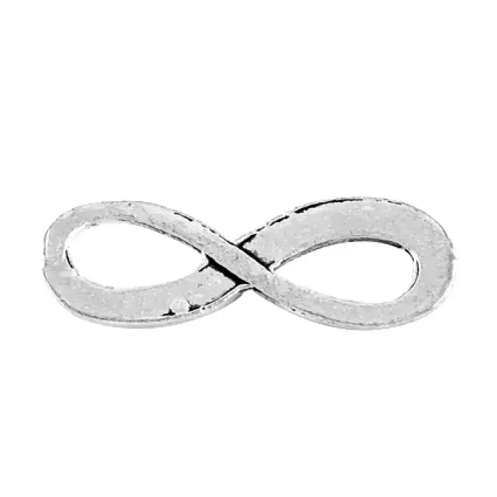 Коннектор для бижутерии в виде символа бесконечности. Изготовлен из металлического сплава с серебристым покрытием.