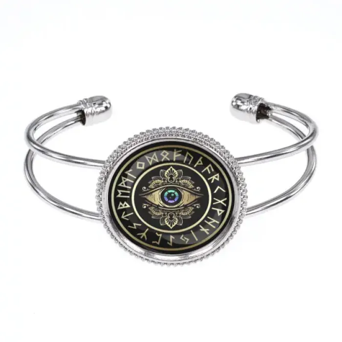 Браслет-амулет с изображением магического глаза. Изготовлен из бижутерного сплава со стеклянным элементом.