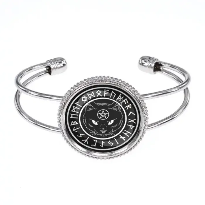 Браслет-амулет с изображением чёрного кота. Изготовлен из бижутерного сплава с покрытием под серебро и стекла.