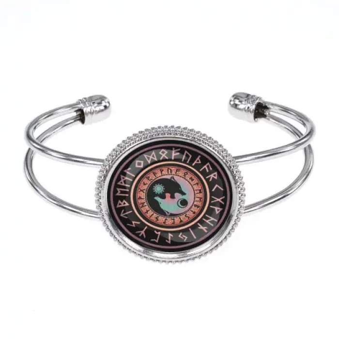 Браслет-амулет с символом волков Инь-Ян. Изготовлен из бижутерного сплава со стеклянной вставкой.