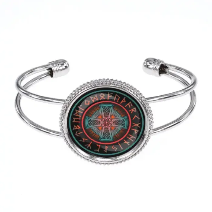 Браслет-амулет с изображением кельтского креста. Изготовлен из бижутерного сплава со стеклянным элементом.