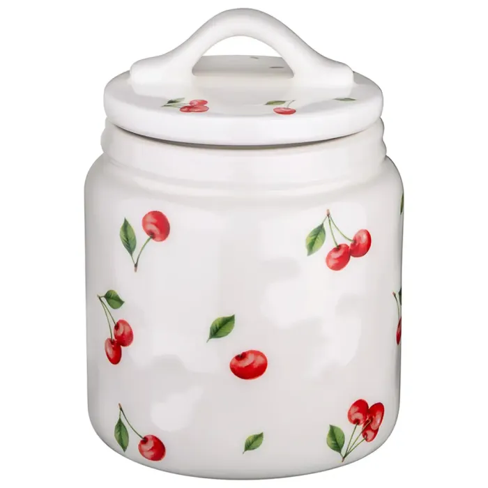 Керамический корпус обеспечивает гигиеничность и защищает содержимое от влаги и посторонних запахов. Крышка плотно прилегает к краям емкости, способствуя сохранению свежести продуктов. Декоративный рисунок нанесен на белую глазурованную поверхность.