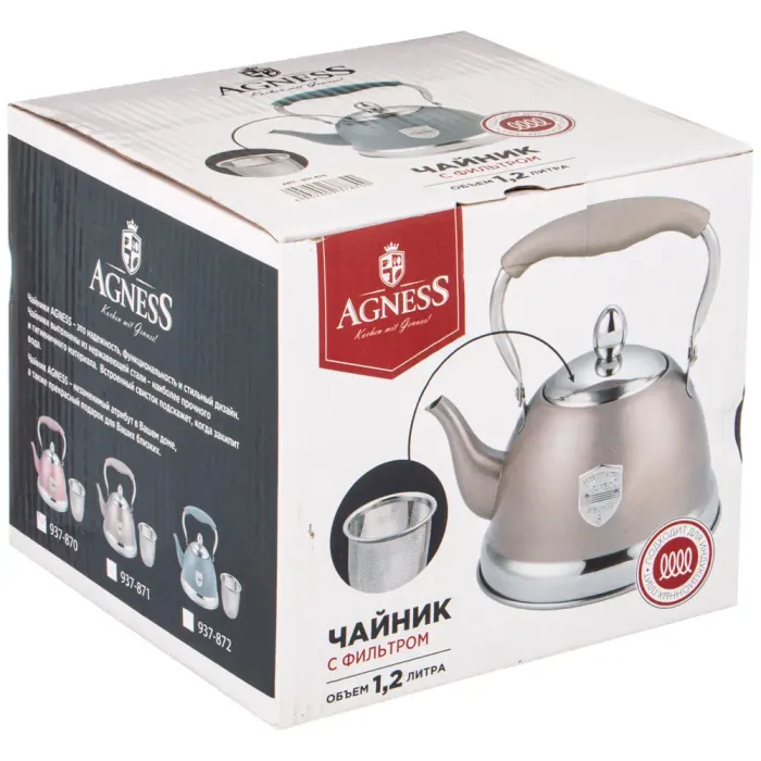 Чайник Agness «Тюдор» предназначен для кипячения воды и заваривания чая. Модель выполнена из нержавеющей стали и оснащена индукционным капсульным дном.