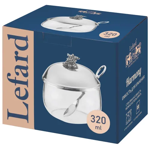 Емкость для хранения серии Harmony объемом 320 мл с ложкой от бренда Lefard предназначена для сервировки и хранения сыпучих продуктов, соусов или варенья. Изделие выполнено из стекла и металла, что обеспечивает гигиеничность и прочность.