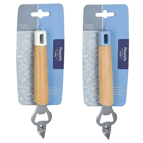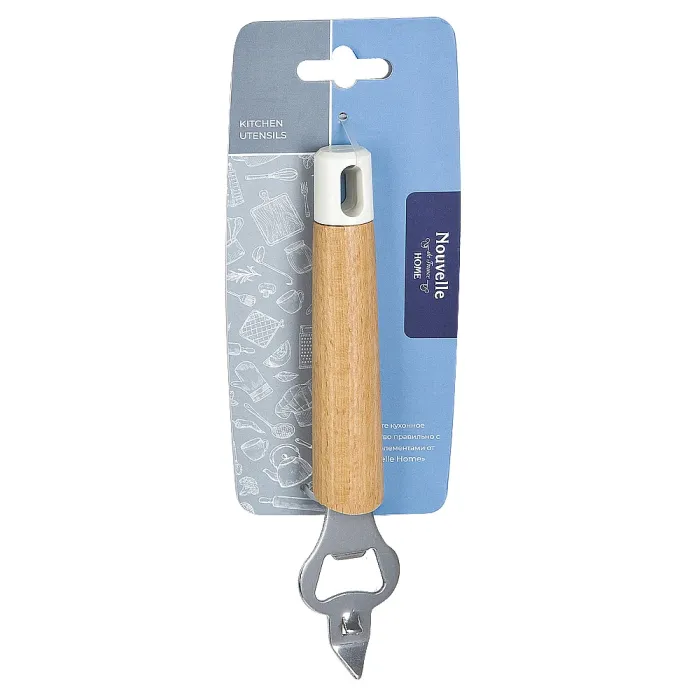 Конструкция открывалки сочетает рабочую часть из нержавеющей стали с ручкой из обработанного бука и элементами из полипропилена. Эргономичная форма ручки подходит для рук разного размера. Изделие оснащено отверстием для подвешивания, что упрощает хранение на кухне.
