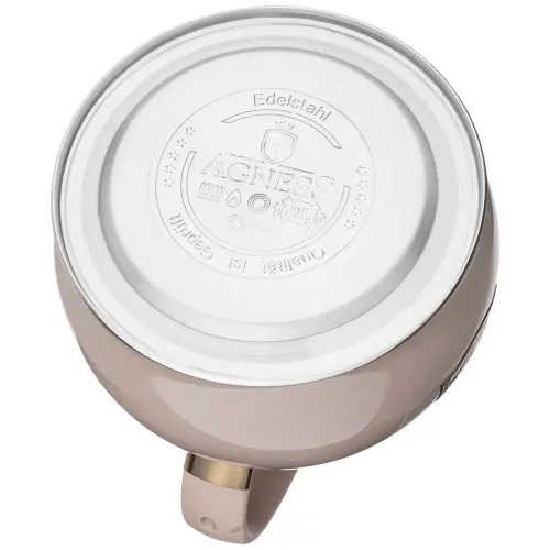 Чайник со свистком Agness объёмом 3 литра предназначен для кипячения воды на плите. Изделие изготовлено из нержавеющей стали, что обеспечивает прочность и гигиеничность. Ключевой особенностью является капсульное индукционное дно, которое способствует равномерному нагреву.
