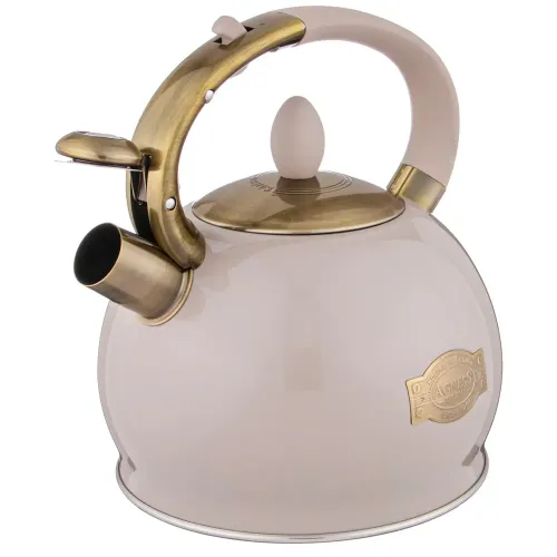 Корпус чайника выполнен из нержавеющей стали, устойчивой к коррозии. Капсульное дно содержит алюминиевую прослойку для эффективного распределения тепла. Конструкция включает удобную ручку с клапаном для налива и встроенный свисток, сигнализирующий о закипании. Поверхность имеет жаропрочное покрытие и выполнена в дымчато-сером цвете.