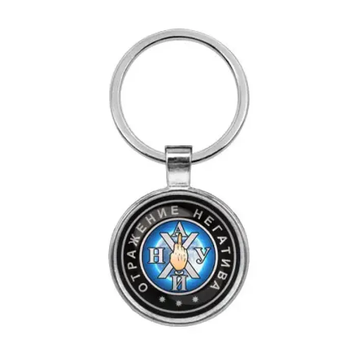 Брелок из бижутерного сплава и стали с покрытием под серебро и выпуклой стеклянной линзой.