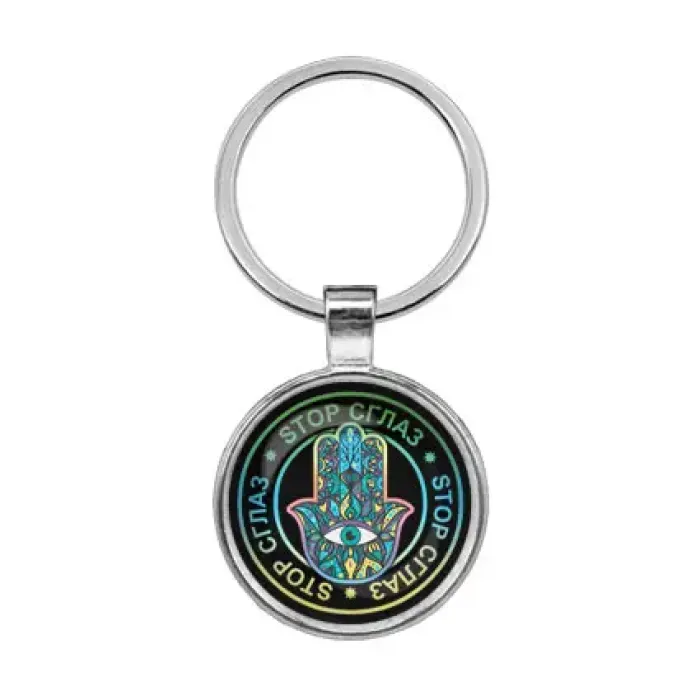 Брелок для ключей из бижутерного сплава со стеклянной линзой и изображением, традиционно связанным с защитой от сглаза.