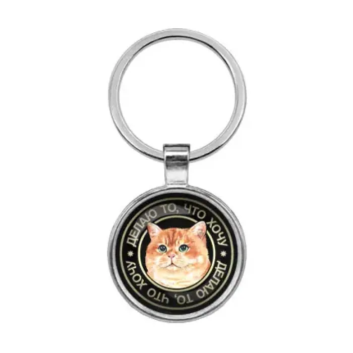 Брелок для ключей из бижутерного сплава с изображением кота под стеклянной линзой.