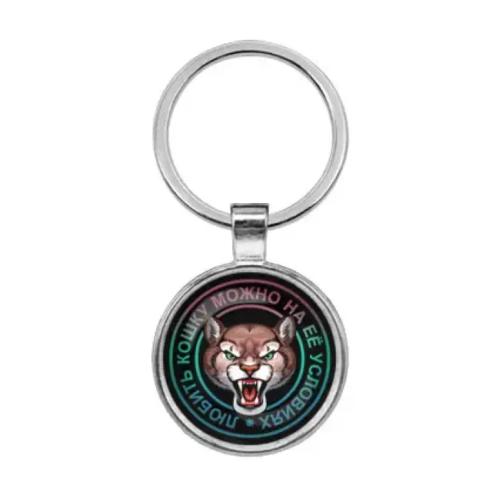Брелок с изображением кошки. Изготовлен из бижутерного сплава и стали с покрытием под серебро. Изображение защищено выпуклой стеклянной линзой.