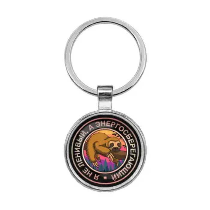 Брелок из бижутерного сплава и стали с покрытием под серебро. Изображение защищено выпуклой стеклянной линзой.