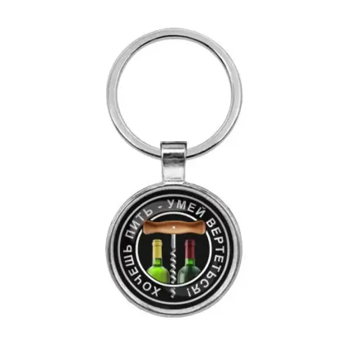 Брелок из бижутерного сплава, стали и стекла с покрытием под серебро и выпуклой стеклянной линзой.
