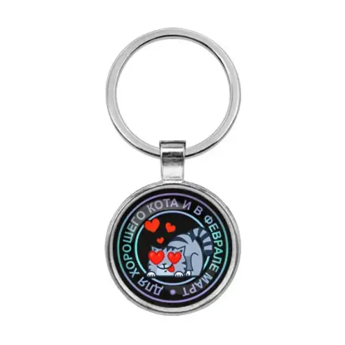 Брелок «Для хорошего кота» из бижутерного сплава и стали с покрытием под серебро. Изображение защищено выпуклой стеклянной линзой.