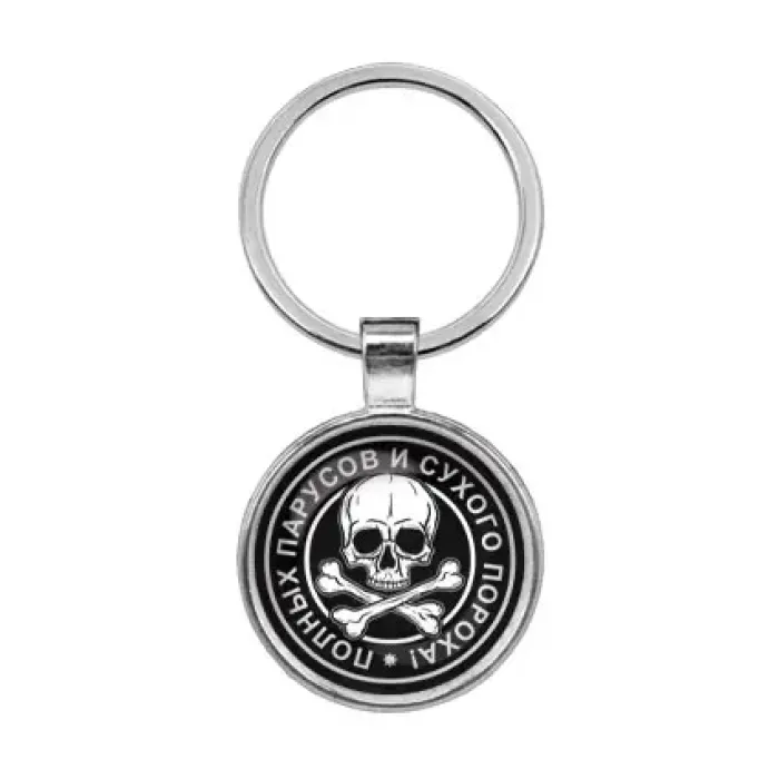 Брелок с пиратской символикой, изготовленный из бижутерного сплава, стали и стекла.