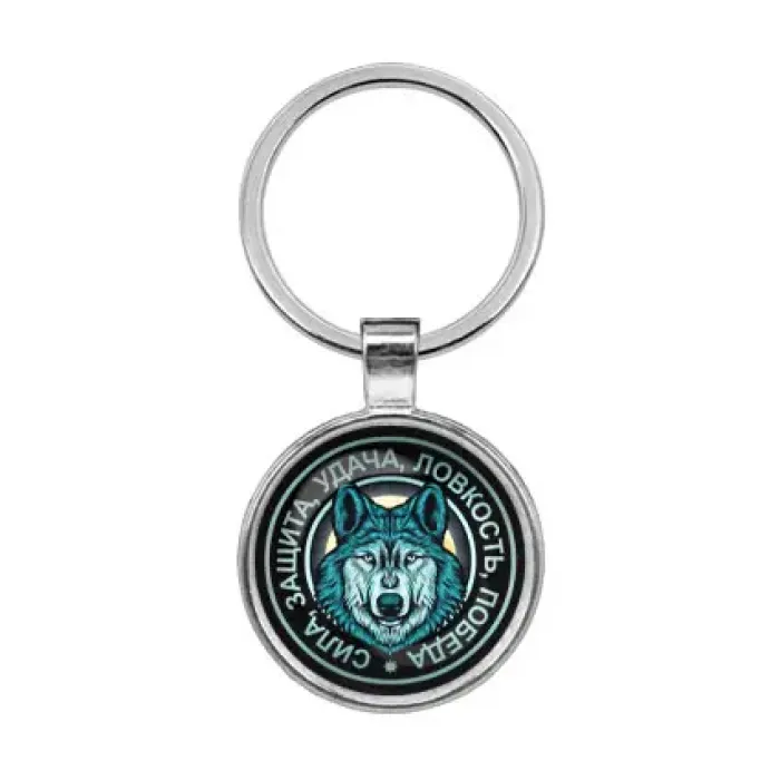 Брелок с изображением волка из бижутерного сплава со стеклянной линзой.