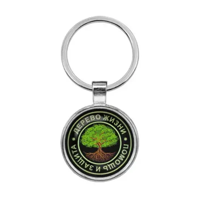 Брелок «Дерево жизни» из бижутерного сплава со сталью и покрытием под серебро. Изображение защищено выпуклой стеклянной линзой.