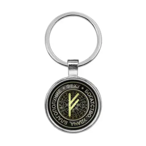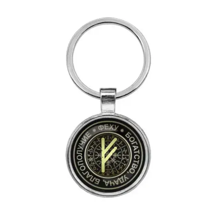 Брелок с символом руны Феху. Изготовлен из бижутерного сплава, стали и стекла.