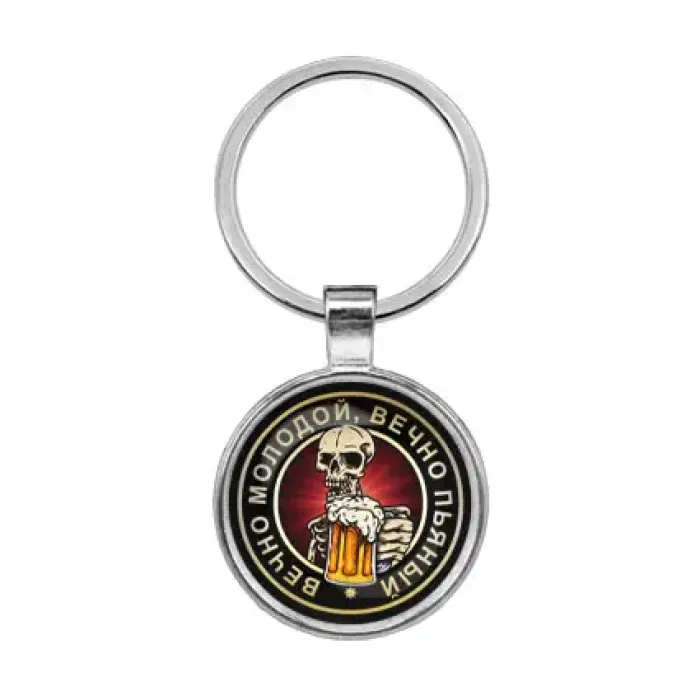 Брелок "Вечно молодой, вечно пьяный" — это стильный аксессуар, который станет отличным подарком для друзей и близких. Он выполнен из бижутерного сплава с покрытием под серебро и дополнен элементами из стали и стекла. Диаметр брелка составляет 28 мм, а изображение защищено выпуклой стеклянной линзой, что придаёт ему особую привлекательность.