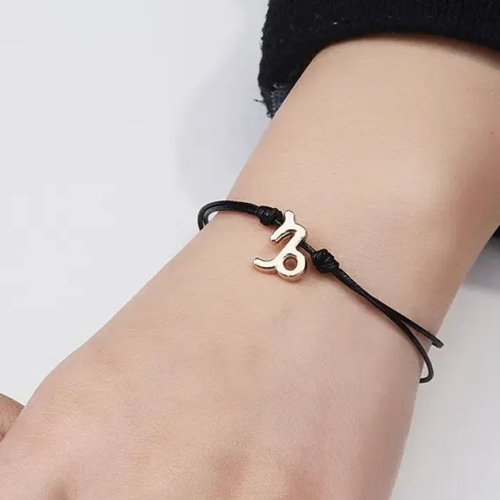 Браслет на чёрной нити «Знаки Зодиака - Козерог» — это стильный аксессуар, который не только подчеркнёт индивидуальность, но и станет символом астрологической принадлежности. Изготовленный из бижутерного сплава с покрытием под золото, он выглядит элегантно и привлекательно.