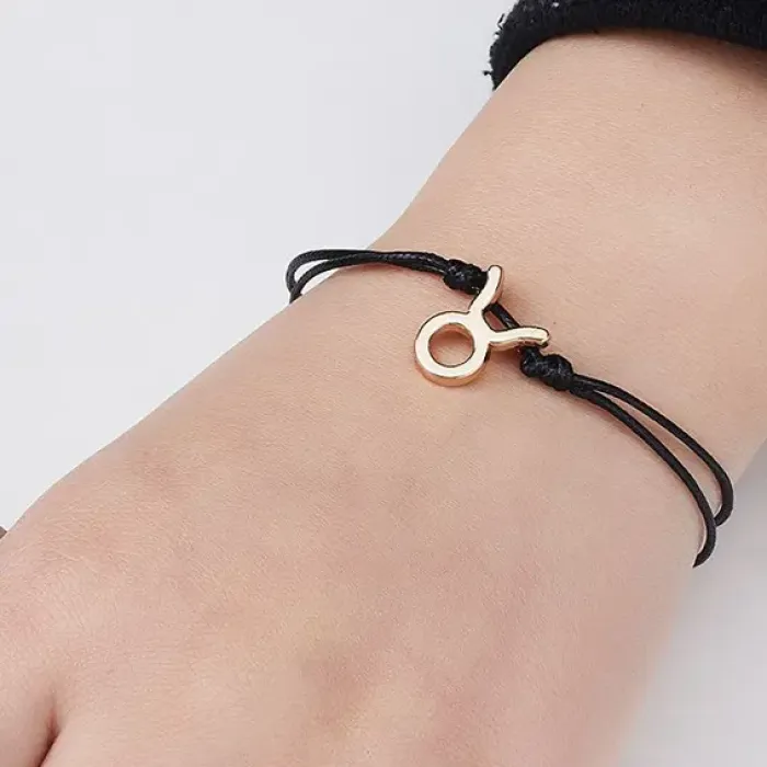 Браслет на чёрной нити с символикой знаков зодиака — это не только стильный аксессуар, но и оберег, который традиционно ассоциируется с защитой и гармонией. Изготовленный из бижутерного сплава с покрытием под золото, он привлекает внимание своим элегантным дизайном.