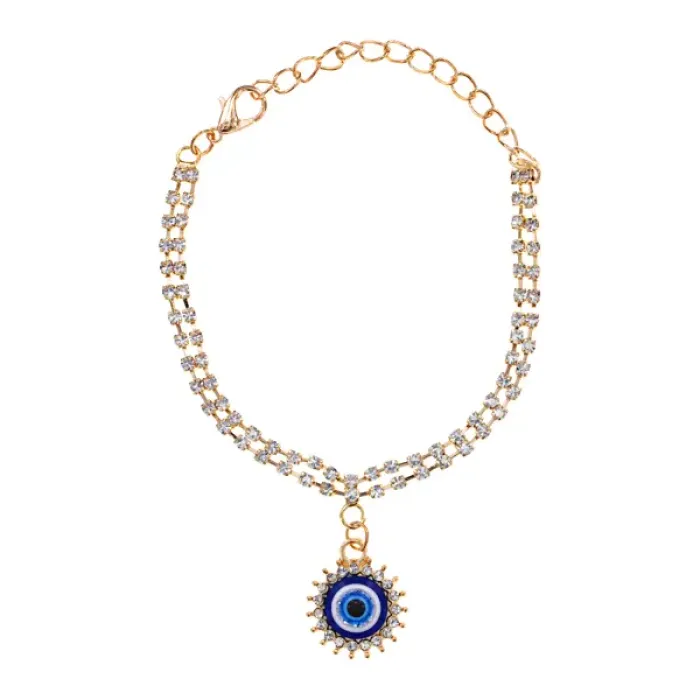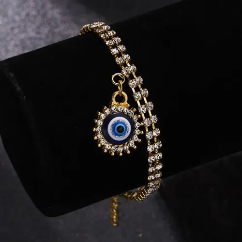 Бижутерный браслет с подвеской в виде символа Глаз Фатимы, украшенный стразами.
