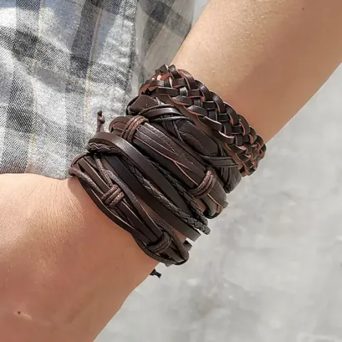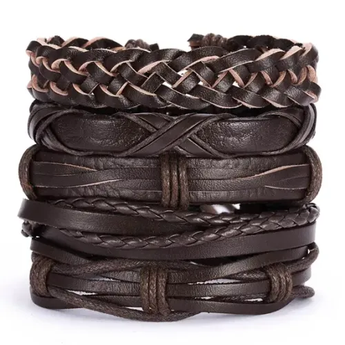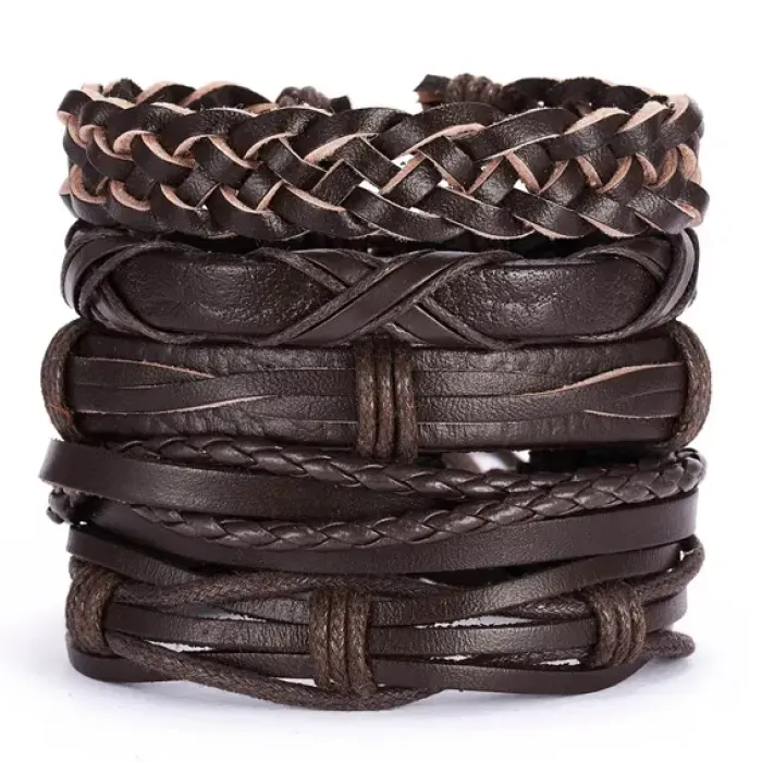 Набор из пяти браслетов для ношения, выполненных из кожи коричневого цвета. Браслеты регулируются по длине.